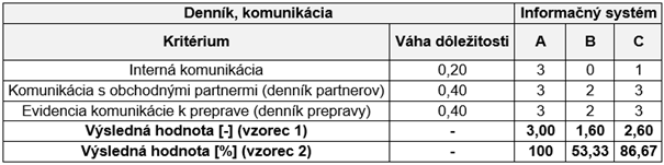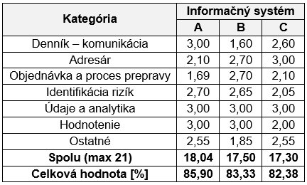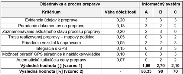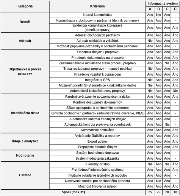 V tomto kontexte má analýza funkcionalít informačných systémov zásadný význam. Umožňuje posúdiť, do akej miery sú jednotlivé systémy pripravené podporovať digitalizované procesy, identifikovať riziká v reálnom čase a minimalizovať prevádzkové či administratívne hrozby. Z toho dôvodu bola realizovaná prípadová štúdia, kde bola použitá viackriteriálna analýza vybraných informačných systémov používaných v cestnej doprave a zasielateľstve.