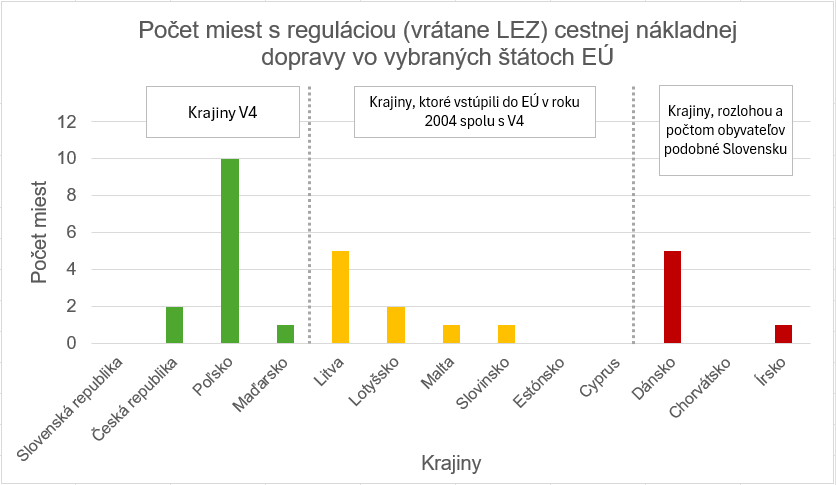 Obr. 2. Porovnanie počtu miest s reguláciou cestnej nákladnej dopravy vrátane nízkoemisných zón vo vybraných štátoch EÚ