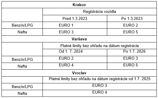 Poľsko patrí medzi krajiny V4, ktoré už zaviedli funkčné nízko emisné zóny (LEZ). V súčasnosti sa nachádzajú v troch veľkých mestách: Krakov, Varšava a Vroclav. Všetky zóny fungujú v nepretržitej prevádzke a limity sú stanovené podľa dátumu registrácie vozidla a typu pohonu. Podmienky pre vstup sú rozdelené v tabuľke 2: