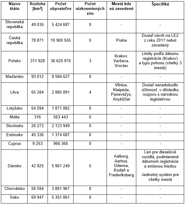 Z tabuliek vyplýva väčšina analyzovaných krajín V4 a štátov EÚ z roku 2004 (vrátane Slovenska, Maďarska, Lotyšska, Malty, Slovinska, Estónska a Cypru) nemá zavedené nízkoemisné zóny. Výnimkou je Poľsko s 3 zónami a Česko/Litva, kde sú zóny zatiaľ neúčinné (obr.1).