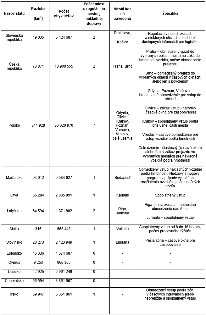 2.3 Regulácia nákladnej cestnej dopravy v centrách miest a LEZ v štátoch podobných Slovensku z hľadiska rozlohy a počtu obyvateľov