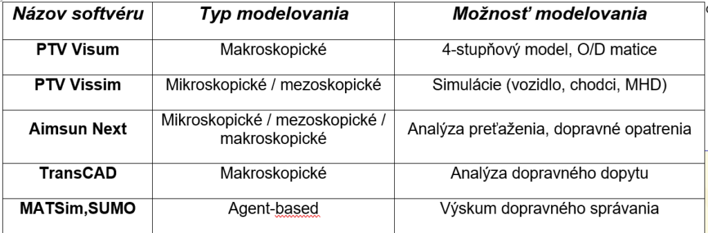 Pri tvorbe dopravného modelu je softvér nevyhnutnou a kľúčovou súčasťou. Každý model vyžaduje odlišnú úroveň detailu a výpočtovú náročnosť, ale aj dostupnosť dát. Tieto aspekty je možné použiť následne v rôznych softvérových vybaveniach. Tie sa od seba môžu líšiť úrovňou agregácie dát alebo metodikou modelovania. Určité softvéry využívajú štvorstupňový prístup, iné môžu opisovať dynamiku pohybu vozidiel v reálnom čase. Nasledujúca tabuľka sprostredkováva vybrané softvéry používané v rámci dopravného modelovania.
