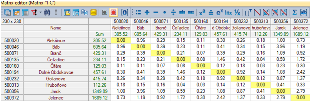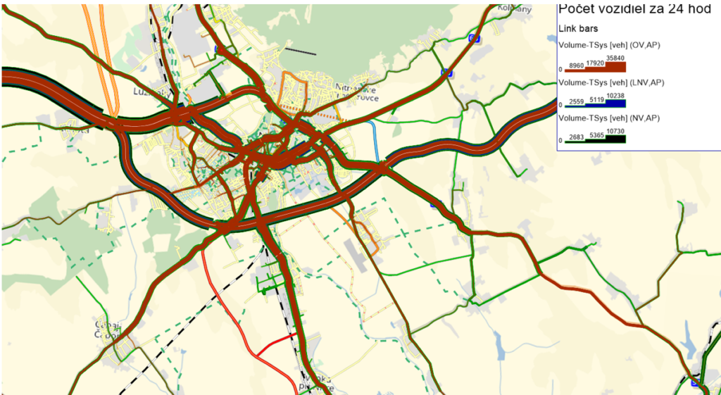 Dôležitým aspektom sú matice zdroj cieľ, ktoré majú uložené informácie o smerovaní dopravných prúdov pre jednotlivé druhy dopravy. Vizuálne sa znázorňujú zaťažením na dopravnú sieť, ktorú je možné vidieť v rámci obr.2.