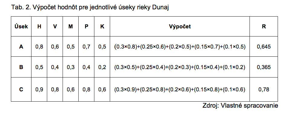 Tab. 2. Výpočet hodnôt pre jednotlivé úseky rieky Dunaj