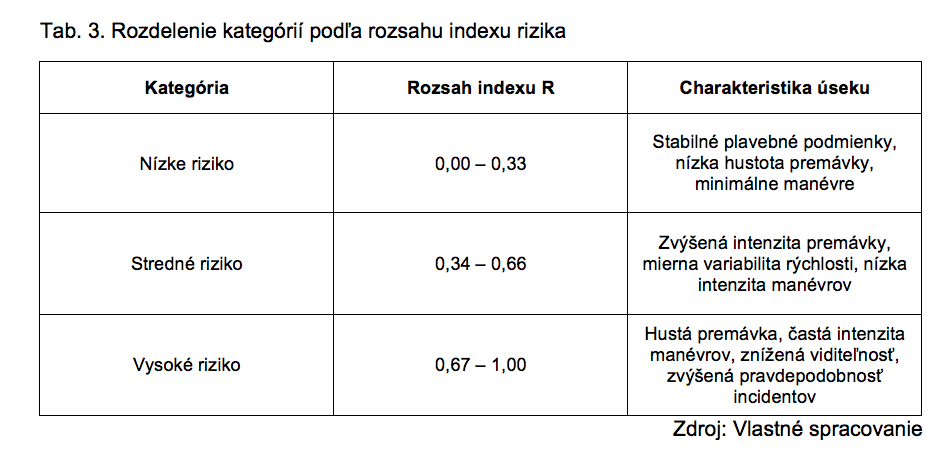 Výsledné hodnoty indexu rizika je možné rozdeliť do troch kategórií, na základe ktorých sa stanový úroveň rizika na danom úseku [16].