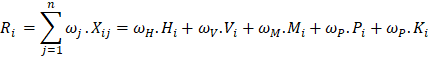 ω_H, ω_V, ω_M, ω_P, ω_P, sú váhy jednotlivých indikátorov,